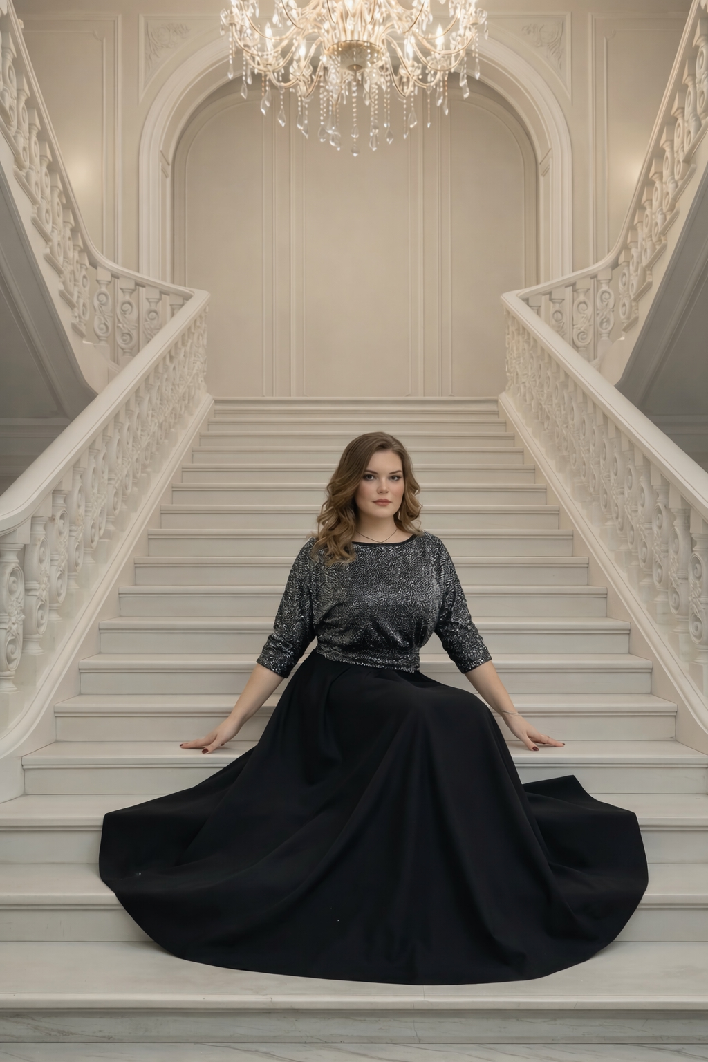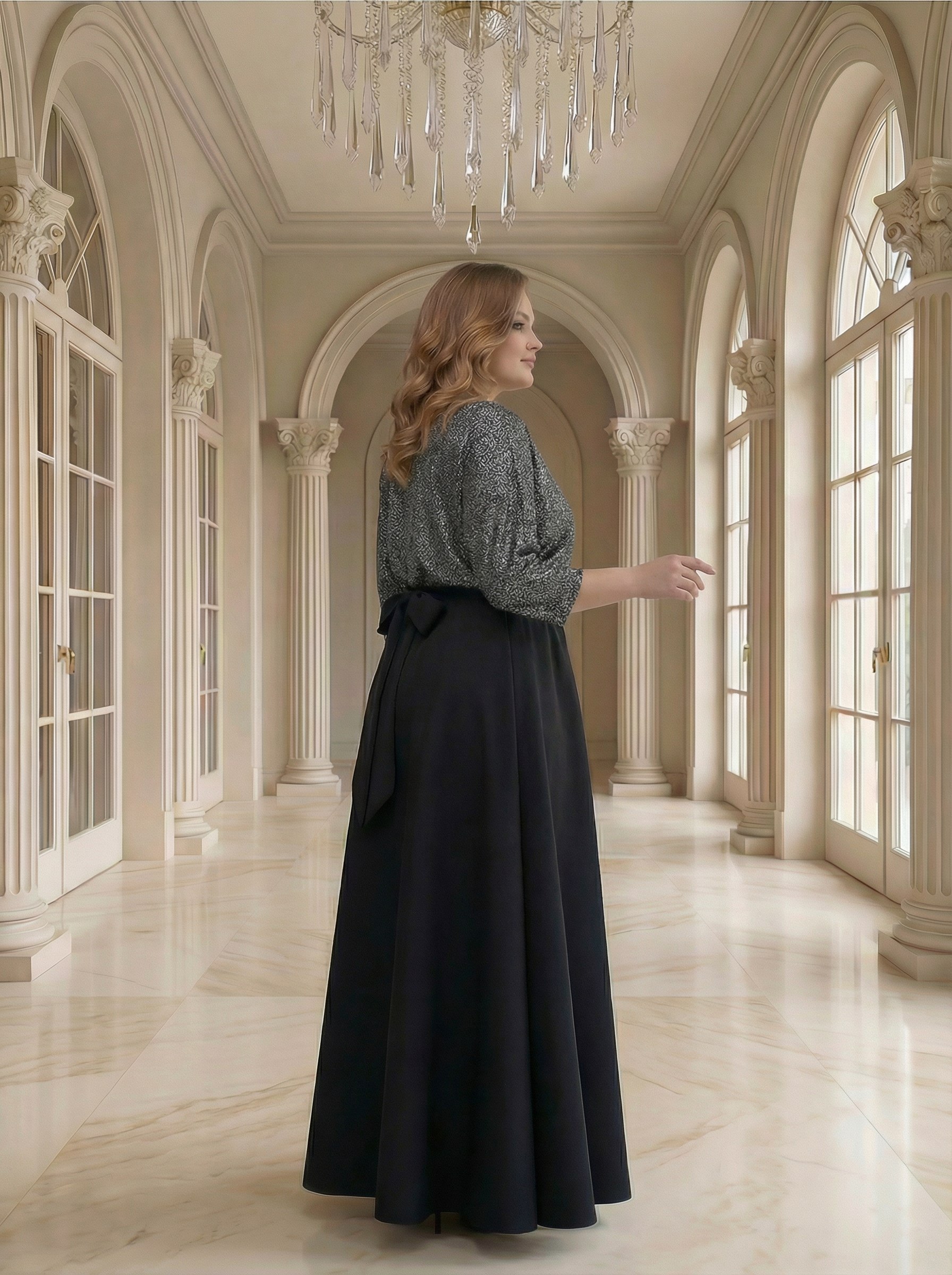 Вечернее платье большого размера для женщин — стильная модель для особых случаев. Верх выполнен из мягкого трикотажа с люрексом, который красиво переливается при искусственном и дневном освещении, придавая изысканность образу. Юбка сшита из качественной костюмной ткани, она держит форму и создает плавный силуэт, визуально вытягивает фигуру и делает образ стройнее. Длинное праздничное платье идет в комплекте с поясом, подчеркивая линию талии и корректирует фигуру.